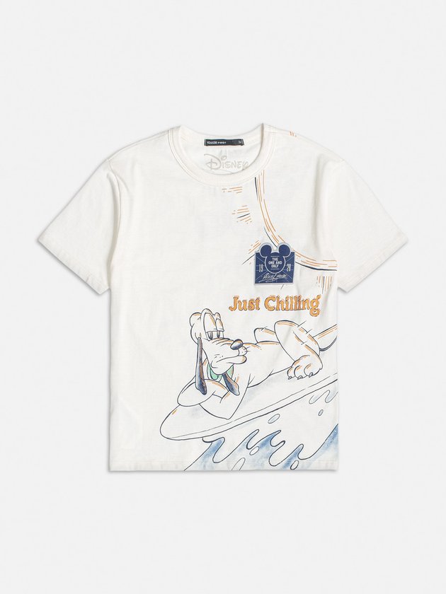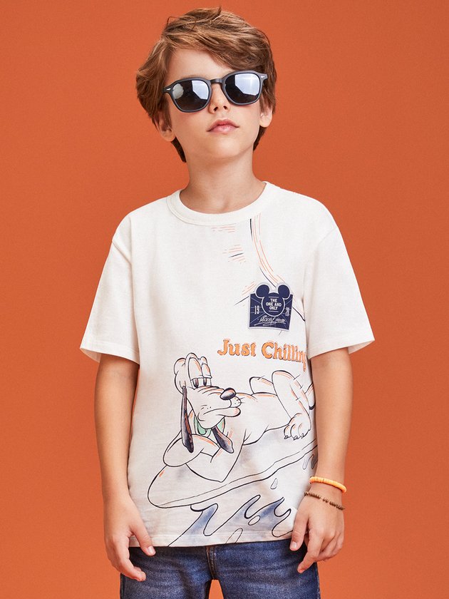 Camiseta off white Youccie feita em malha com estampa licenciada da disney, essa peça traz o Pluto e o Mickey para deixar tudo ainda mais divertido. Possui gola em ribana e etiqueta decorativa da marca dando um toque especial. Composição: 100% algodão. Ref.: I1138
