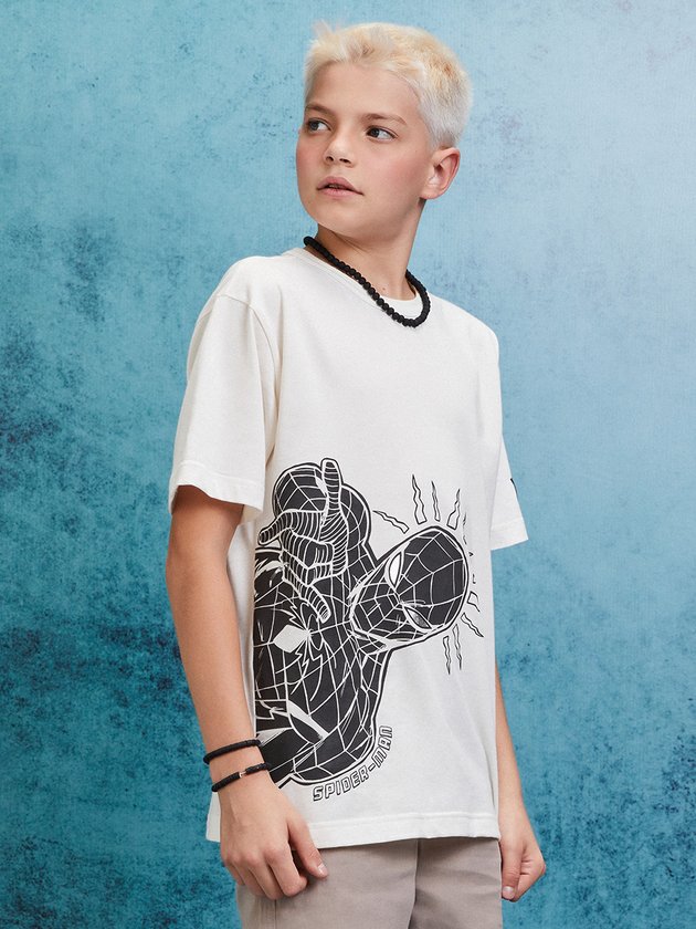 Camiseta infantil Youccie, licenciada pela Marvel com estampa do Homem-Aranha. Uma escolha para os meninos que adoram ação e aventura. A peça foi confeccionada em malha, e também apresenta etiquetas decorativas, adicionando um toque especial ao visual. Composição: 100% algodão. Ref.: D1811
