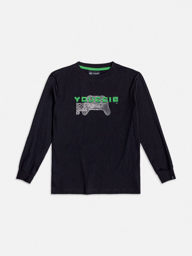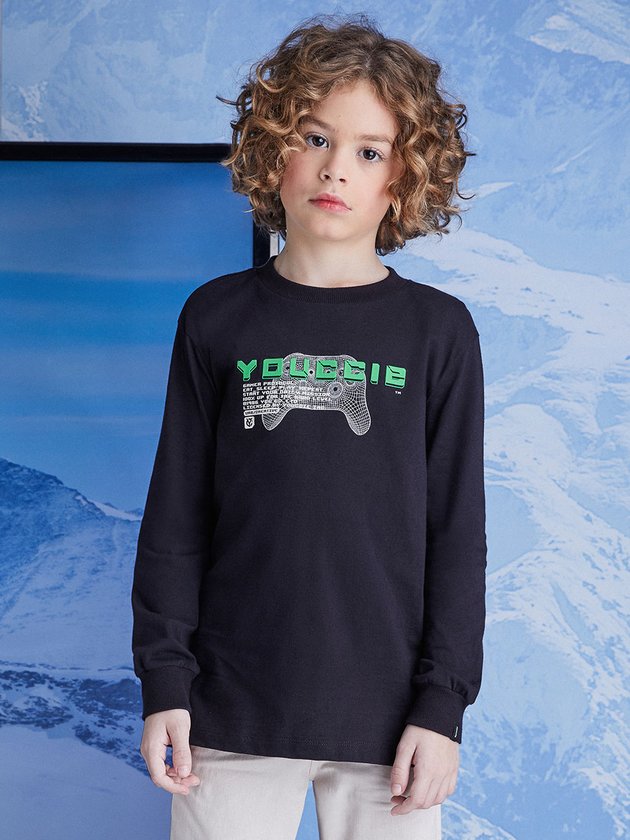 A camiseta preta Youccie redefine o estilo casual para os meninos. Confeccionada em meia malha, proporciona conforto e durabilidade, sua estampa gamer adiciona um toque moderno e descontraído, ideal para os amantes de jogos. Composição: 100% algodão. Ref.: D2039
