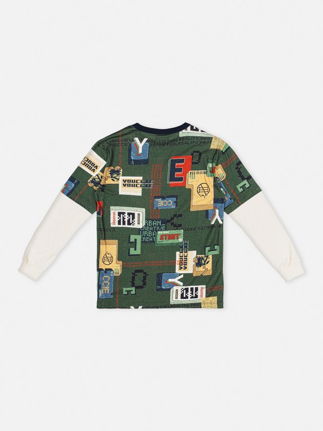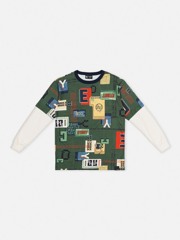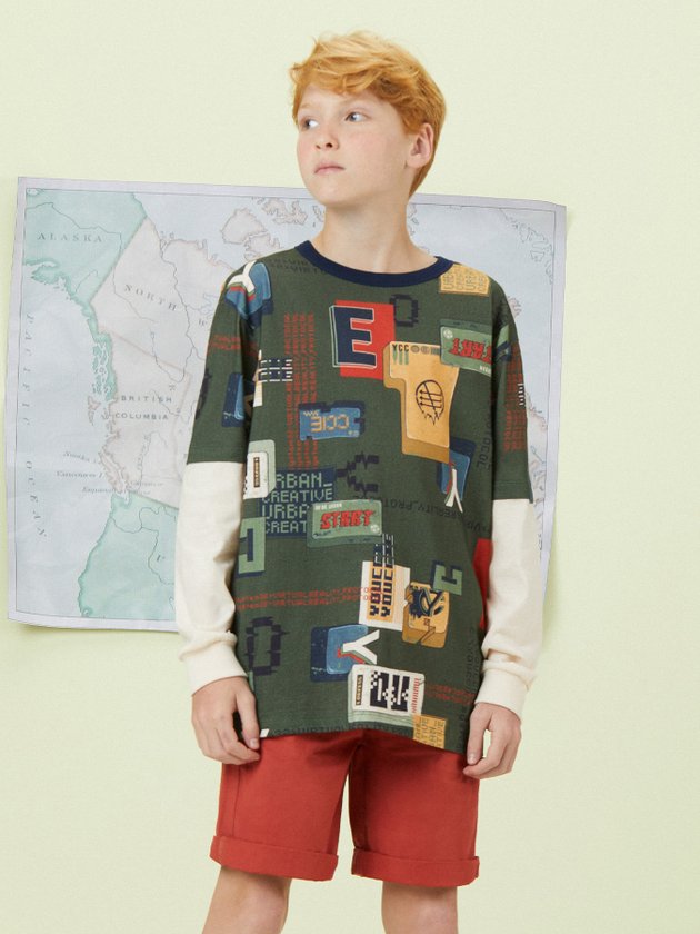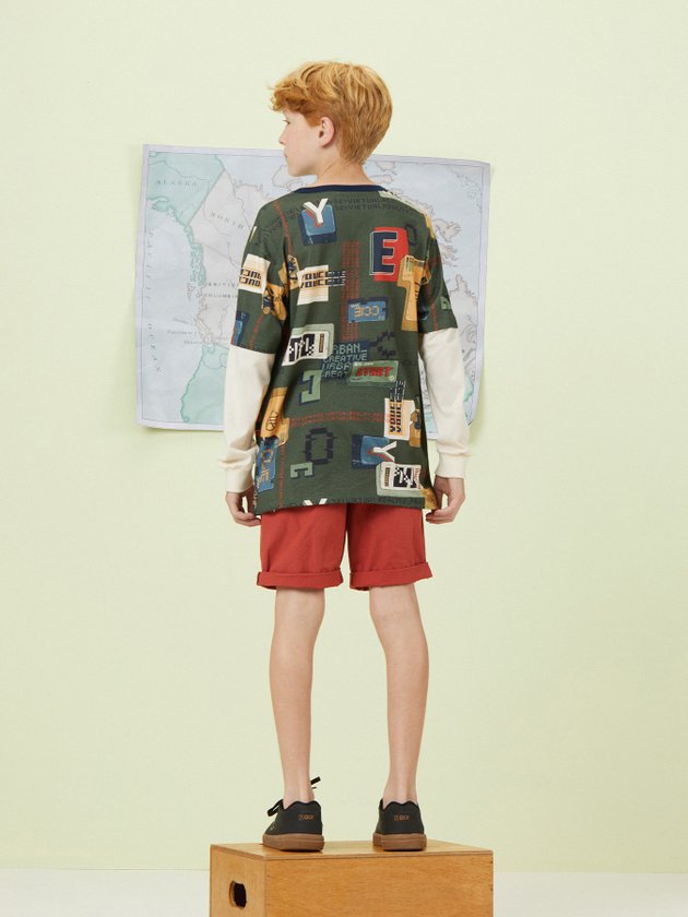 Esta camiseta de manga longa para menino é confeccionada em meia malha e apresenta estampa rotativa. As mangas são na cor creme e a modelagem é street, conferindo um estilo moderno. O decote e os punhos são em ribana, garantindo um ajuste confortável. Ideal para combinar com calça jeans e criar um visual descolado. Composição: 100% algodão. Ref.: D1483
