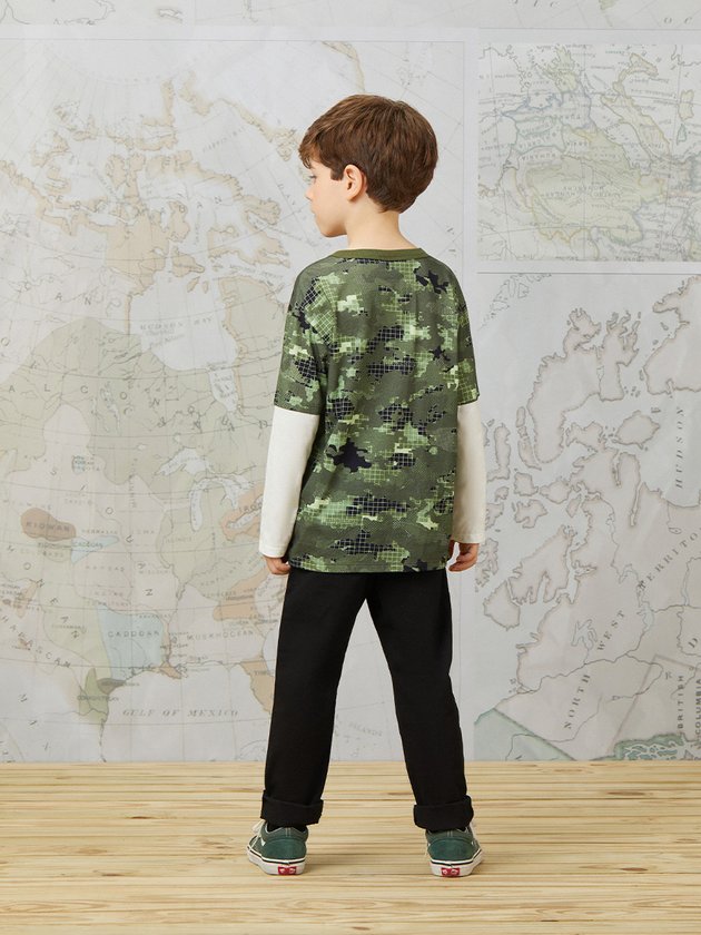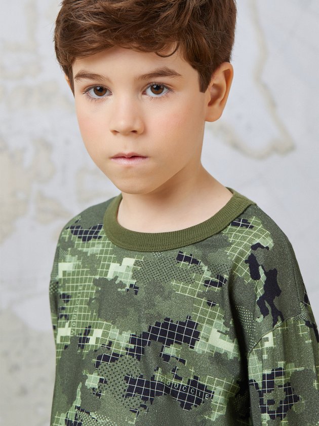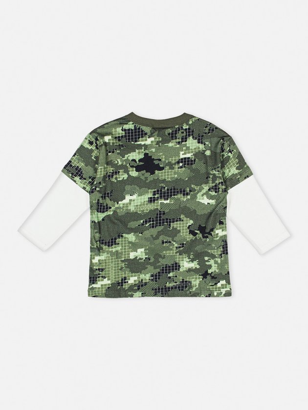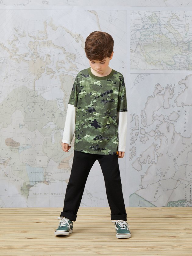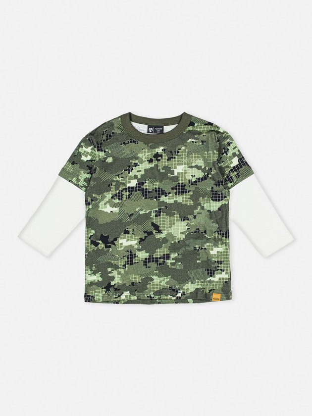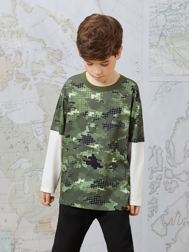 Camiseta de menino com estampa camuflada e modelagem street, perfeita para um look descolado. Possui manga longa na cor pérola e etiqueta clips marrom, adicionando um toque de estilo extra. Composição: 100% algodão. Ref.: I0939