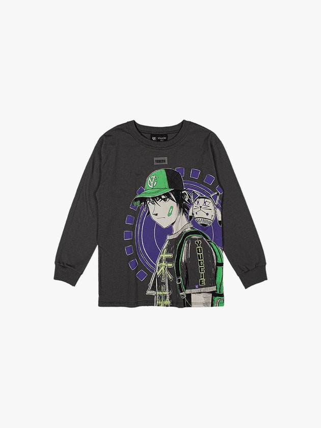 Camiseta de manga longa nunca é demais no guarda roupa dos meninos, confeccionada em malha na cor cinza a Camiseta Anime Youccie traz estampa exclusiva na parte frontal, acabamento de ribana nos punhos e decote além da etiqueta decorativa em material emborrachado, os meninos vão amar. Composição: 100% algodão. Ref.: D1006