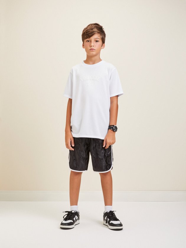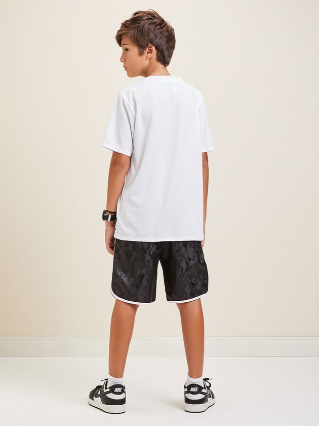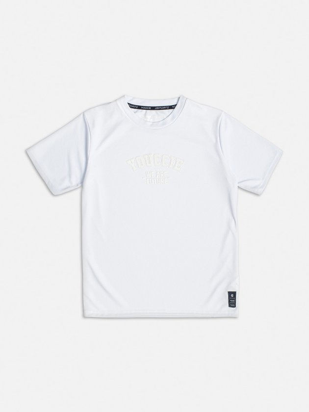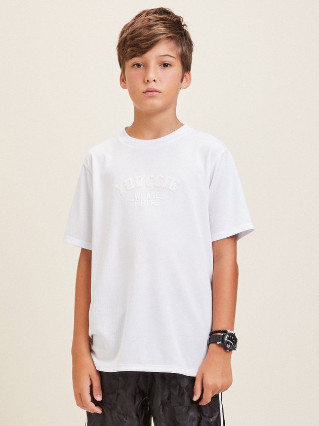 Camiseta branca Youccie desenvolvida em malha esportiva leve, ideal para os meninos, seja para praticar esportes ou para o dia a dia. Apresenta estampa e etiqueta decorativa na frente, adicionando estilo. Composição: 100% poliéster. Ref.: D1894